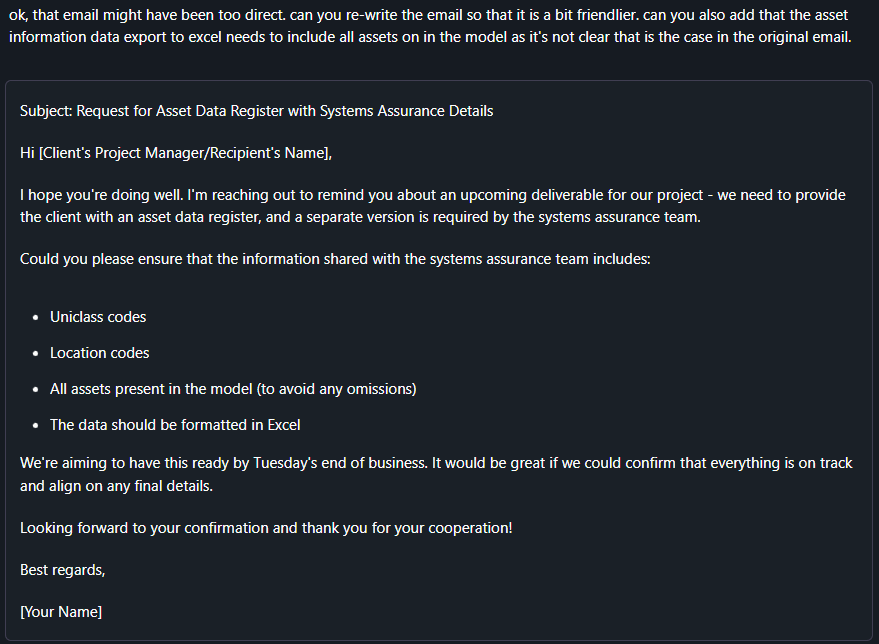 Beyond just organising thoughts, LLMs can be used to help plan out tasks and projects. With the right inputs, AI can generate checklists, outline project milestones, and assist in resource management planning. For example, if you’re kicking off a new BIM implementation across a large infrastructure project, GPT can assist by suggesting workflows, breaking down tasks, or even refining the documentation you need to share with stakeholders. This can streamline both the brainstorming and execution phases, allowing teams to stay aligned with project goals.
