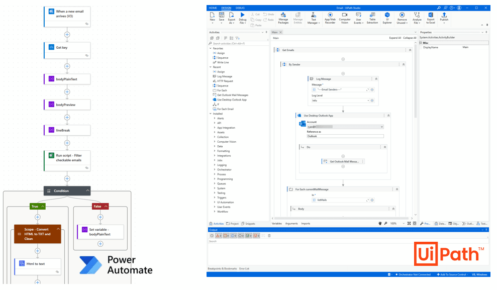 Both Power Automate and UiPath allow you to create workflows using pre-built connectors and nodes or create your own customised ones to automate tasks such as extracting content from emails, categorising them, or triggering specific actions based on the content of the message.